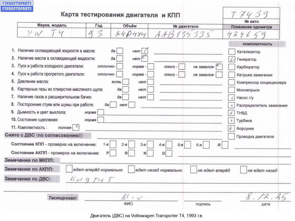 | Казань | 2003 | 074100091AX, 2003, 2.5л, Дизель, TDI, AJT, AJT144336, 074100091AX, Микроавтобус, серебристый, Фото не актуально, с запчасти отделены: Подушка крепления двигателя, Маховик, Форсунка топливная, ТНВД, AJT144336 | - | Г | Н | ТУ, прокручивается, состояние ГРМ - нормально, поддон - |нормально, клапанная крышка - нормально, эмульсия - нет, 2 массовый, насос ГУР - дефект шкива, нет пробки, + ЗАСЛОНКА, | |||